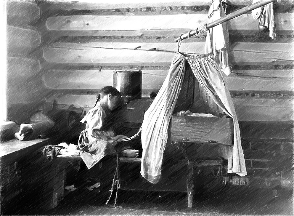 В июне на болоте уже собирали первые стожки. В том году Троица прошла «зарáнье» – 3 июня. Недалеко от хутора Никита обкосил просеки, и они с Ганной ворошили сено. Солнечно и парит. «Быть буре». Поднялся сильный ветер. Надвигалась гроза. Быстрее в селище. Загнали в хлев овец, коров, коня… К тому же, Ганна стала слабеть и кричать, что рожает. Никита крикнул соседку, та сразу поняла в чём дело. Прибежала, растопила печь, поставила греться чугуны с водой. Детей загнали на полати в дальний угол хаты. На улице ветер поднимал песок выше крыши, и разразилась гроза с ливнем. В эти минуты кричала Ганна, через несколько минут закричала маленькая девочка. Повитуха обрезала пуповину, завязала пуп, вытерла ребёнка, замотала в чистую льняную тряпицу. Соседский мужик зашёл после грозы посмотреть, что за переполох в хозяйстве у Никиты. Из-за «задергушки» вышла соседка со свёрточком на руках. Красное личико девочки совсем не понравилось соседу: «О-о-о. какое-то перекошенное дитя. Накрой его подушкой, чтобы «захлопилось».