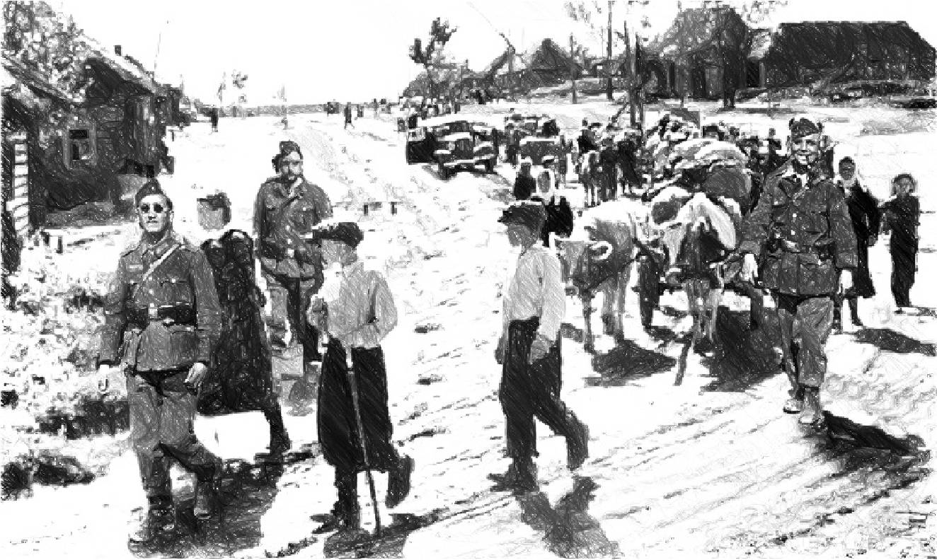Однажды днём тишину векового леса и маленькой деревеньки разорвал металлический треск. Дети бросились в рассыпную, и все жители затаились. По песчаной улице быстро передвигались какие-то механизмы, а на них сверху сидели и не падали?!, люди в невиданной одежде и круглых железных шапках (касках). Местные говаривали, что немцы в Бабуничах «были на третий день». Немцы сразу обнаружили большое стадо коров. «Не хорошо получилось», – осознавали двойственность ситуации пастухи, как будто для немцев коров пригнали. Немцы обрадовались хорошему молочно-мясному стаду, отблагодарили пастухов. Дали каждому по корове. Никита привёл в своё селище очень хорошую белую корову. Больше всех корове радовалась мать Ганна и Олька.