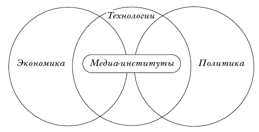 Медиа является центром трех перекрывающих друг друга сфер, формирующих порядок общества.