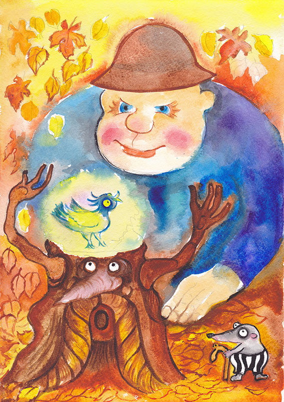 А добрый Великан Сан-Саныч нашёл красивую оранжевую лесную полянку. Там он вынул маленького птенчика из кармана, ласково погладил малыша по головке, положил его на старый пень, который удивлённо следил за происходящим. Так как Великан был волшебником, то умел совершать маленькие, да и большие чудеса. Это уж как кому нравится. Положил он птенчика на старый пень, погладил, значит, по головке и подул на него своим волшебным дыханием…