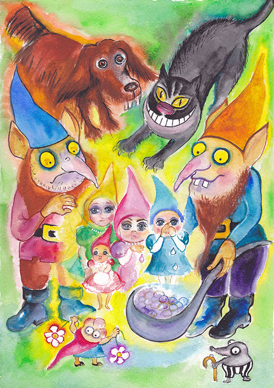 Злодеи рвали цветы и смеялись. Вот они сорвали нежный ирис, скромную незабудку, кокетливую ромашку, испуганный колокольчик. Малышки-феи, дрожа от страха, сбились в кучку и горько плакали. Из их глазок падали крохотные бриллианты слезинок. Злой жадный гном Ульф, стоявший над плачущими феями, собирал разноцветные слезинки в свои большие карманы. Кошка смеялась странным смехом над жадностью гнома и убитыми горем феями. Ведь феи больше никогда не увидят свои любимые домики-цветочки! Разноцветная радуга над поляной становилась всё более бледной, почти серой…