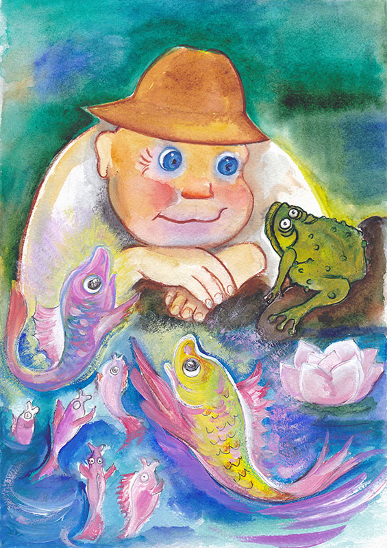 «Ах ты, бедняжка…» – Сан-Саныч разорвал сети браконьеров, бережно достал из них сверкающую чешуёй рыбку, слегка подул на неё своим волшебным дыханием и огромной ладонью осторожно опустил в воду. Рыбка встрепенулась, открыла свои удивительные глаза, в которых отчаяние сменилось радостью. Ещё миг – и маленькая дочь Царицы Рыбы начала весело плескаться, играя с подружками. Закрывшиеся от испуга розовые лилии, жёлтые и белоснежные кувшинки вновь открыли свои прекрасные бутоны, а прозрачные водяные феи запорхали с цветка на цветок. Летнее солнце вновь засверкало на голубом небе.