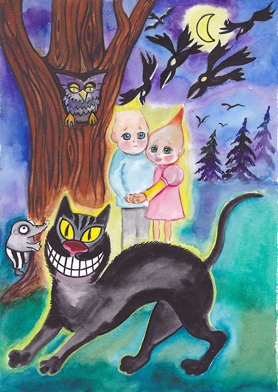 Сан-Саныч всё шёл и шёл… И вот его окутало тёмное одеяло ночи, крохотные звёздочки загадочно мерцали из глубины космоса. Внезапно под огромным старым деревом он увидел двух дрожащих от испуга и усталости маленьких детишек – мальчика и девочку, с большими печальными глазами. Бедные дети остались сиротами и ушли из своей деревни. Долго-долго шли они. Шли день, шли ночь. Устали, проголодались, заблудились в незнакомом лесу. Страшно им было. Страшно и одиноко. Сели они под большое старое дерево. Взяли друг дружку за руки… А вокруг них ходила, странно улыбаясь, огромная Чёрная Кошка. Сан-Саныч схватил камень и бросил в Кошку. Та отскочила в сторонку, выгнула спину, превратилась в Чёрную Ворону и со зловещим криком улетела прочь: «Карр!.. Карр!..»