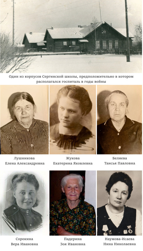 Часть персонала Сергинской больницы перешла на работу в госпиталь. Среди них: Зеленева Анастасия Михайловна, Жукова Екатерина Яковлевна. После закрытия госпиталя они вернулись в больницу и вспоминали, как присутствовали на операциях, чистили раны и ухаживали за бойцами.