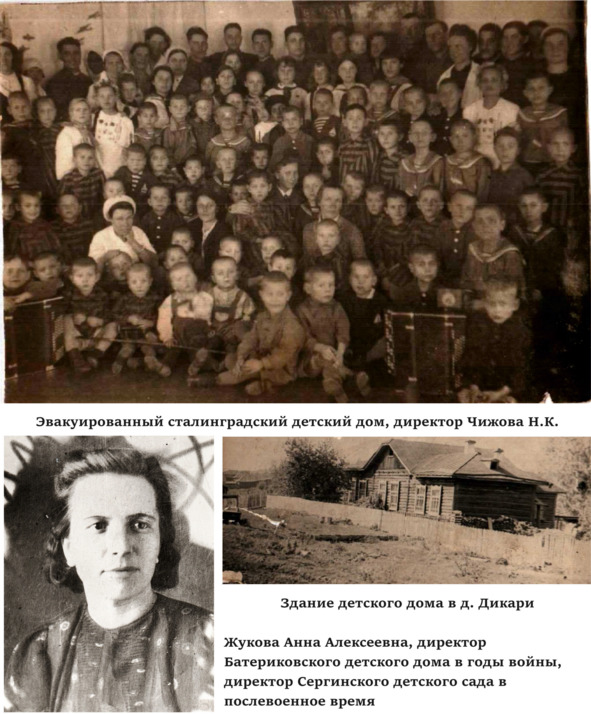 «В сентябре 1942 года к нам в Дикари эвакуировали детдомовских детей и жителей Сталинграда. Дети поступали в основном дошкольного возраста: истощенные, грязные, больные. Но наше государство проявляло большую заботу: на каждого ребенка отпускалось по 600 гр хлеба, жиры, сахар, разные фрукты и крупы. Одним словом, дети были хорошо одеты и накормлены. Спали все на отдельных койках. Детский дом находился в здании школы с 1942 года по 1946 год, до момента, когда всех наших детей не развезли по разным детским домам.