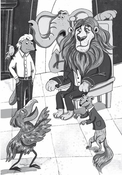 В это время Зубери входил в Зал Особых Совещаний. Его ожидали поднятые по тревоге министр обороны слон Абубакар, начальник межзвериного разведывательного управления ласка Муркина, верховный шаман Бабатанд из деревни Колючий Тупица, Король Лев и незнакомый Зубери андский кондор[20].