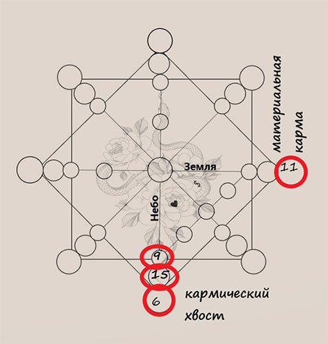 Затем, чтобы получить энергию рода по мужскому роду внизу, складываем энергию кармы прошлых жизней с энергией материальной кармы (11+6=17).