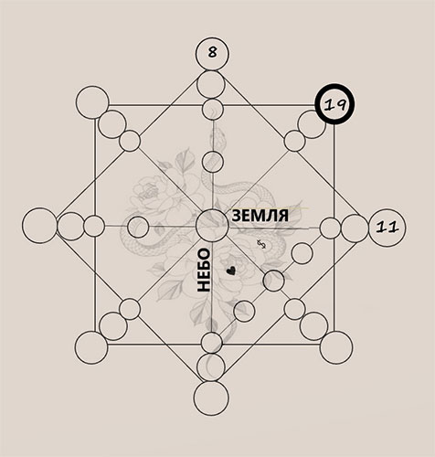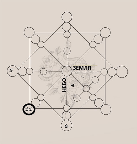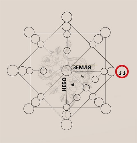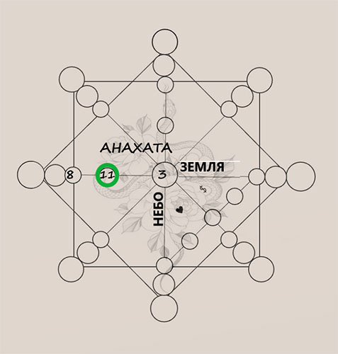 Далее переходим к зоне Анахаты. Это сердечная чакра, отражает потребности человеческой души. Рассчитываем первую точку Анахаты, расположенную на линии Земли. Для этого сложим энергию родительского аркана с энергией зоны комфорта: 8+3=11.