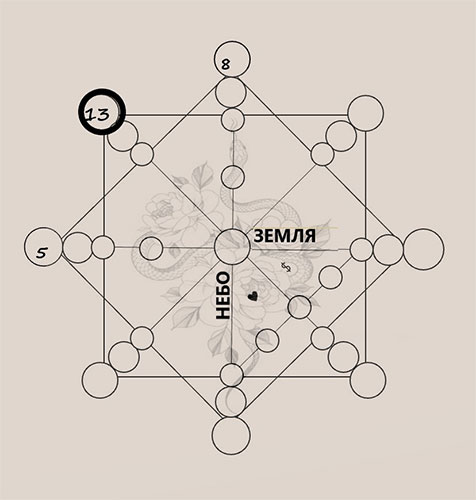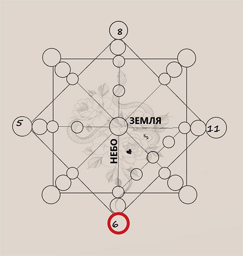 Далее складываем три полученных числа (5+8+11) и получаем число кармы прошлой жизни (6). Это самая нижняя точка в матрице судьбы по вертикали.