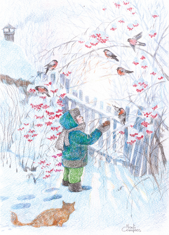 – Снегирики, милые, а как я домой попаду? Только осенью, когда вы обратно полетите? – чуть не расплакался Мишаня, когда понял, что снегири остаются тут ночевать.