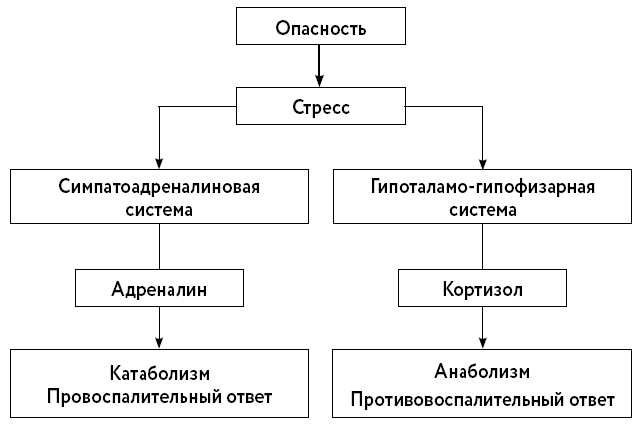 Реакция организма на стресс, как считал Ганс Селье, проявляется общим адаптационным синдромом, который характеризуется тремя фазами: фазой неспецифической мобилизации, которая способствует активности симпатической нервной системы; фазой сопротивления, во время которой организм прилагает усилия, чтобы справиться с угрозой; и фазой истощения, которая наступает, если организм не в состоянии преодолеть угрозу и истощает свои физиологические ресурсы.