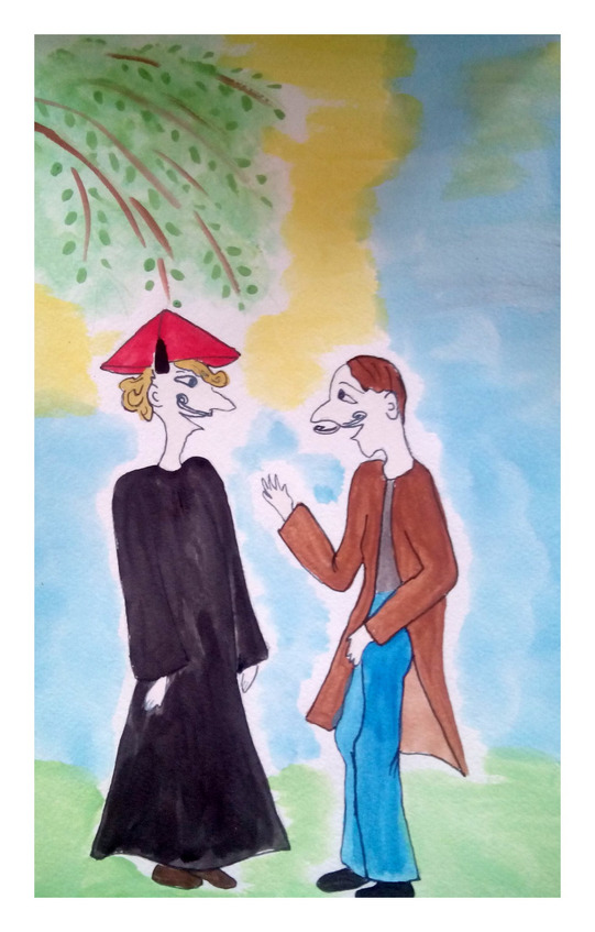 Пока она пробиралась сквозь лес, у нее в голове роилось множество мыслей и начинал назревать план по захвату старухи, но неожиданно одна мысль вылетела и план рухнул. Сквозь деревья девочка увидела поляну, посередине поляны стоял дубовый стол, а за ним вели оживленную беседу два человека. Один, у которого на голове была треугольная шляпа, был похож на учителя математики, он все время что-то чертил, умножал и делил. Другой походил на учителя музыки – он непрестанно размахивал рукой, как дирижерской палочкой.