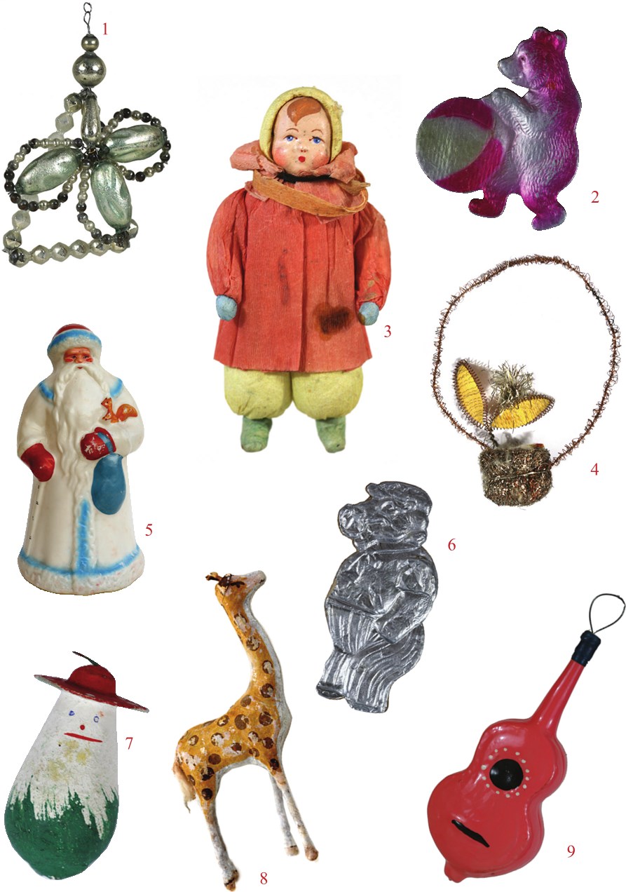 Из коллекции Л. Блатт. 1. Богемская монтированнная подвеска «цветок». 2. Медведь с мячом; картон; 1936–1966 гг. 3. Ребенок в пальто; папье-маше, вата, цветная папиросная бумага; 1920-е гг. 4. Корзинка с цветком; проволока, картон; завод «Москабель», 1940-е гг. 5. Дед Мороз; пластмасса, роспись; 1960-е гг. 6. Бегемот; дрезденская картонажная, фольгированная; 1890–1920-е гг. 7. Гриб в шляпе; прессованная вата, гуашь, роспись, картон; 1960-е гг. 8. Жираф; вата, роспись, слюда; 1950-е гг. 9. Музыкальный инструмент; стекло, ручная роспись; 1920-е гг.