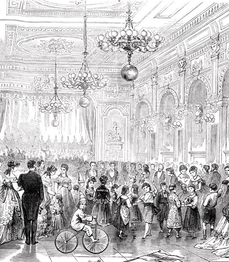 Считается, что первая русская «публичная» елка, украшенная разноцветными бумажными лоскутами, была установлена в 1852 году в Петербурге на Екатерингофском вокзале83. Но лишь начиная с последней трети XIX века украшенные елки стали устанавливаться в общественных местах повсеместно. Например, в той же Казани в первые рождественские дни публичные детские елки устраивались практически во всех театрах и клубах города84. Новогодние балы (часто костюмированные) с великолепными, богато украшенными рождественскими деревьями традиционно проводились в залах Дворянского, Военного и Купеческого собраний. Они не носили замкнутого, сословного характера. Уплатив 50 копеек и получив рекомендацию члена клуба, можно было посетить взрослые и детские новогодние балы и маскарады в Благородном (Дворянском) и Военном собрании, а в Купеческий клуб вход был возможен вообще «без всякой рекомендации»85. Большой танцевальный зал Дворянского собрания, где обычно устанавливалась елка, вмещал более 1200 человек. Новогодние балы и елки обычно продолжались до Крещения – 6 января.
