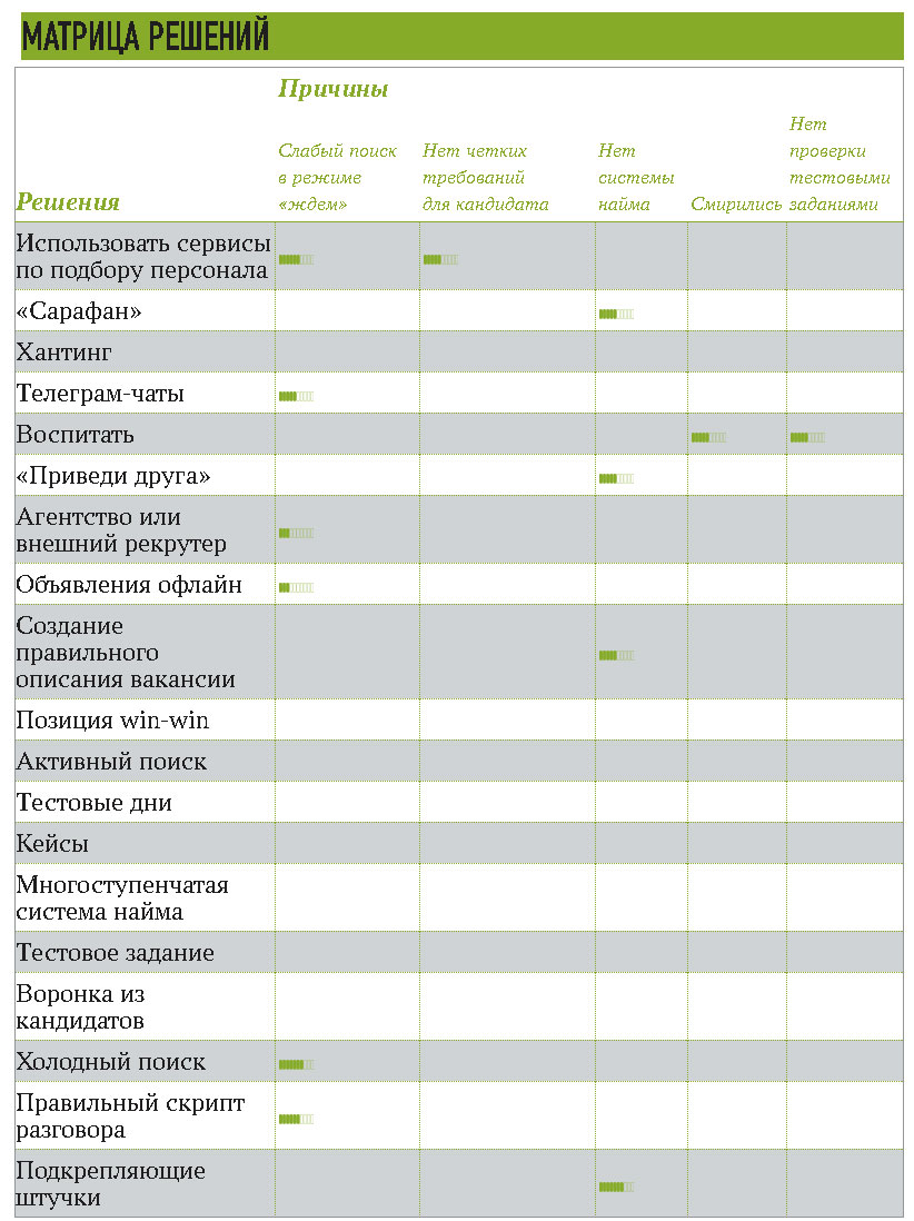Каждая глава начинается с матрицы «Проблема/Решение», линиями отмечена «Степень результативности решения».