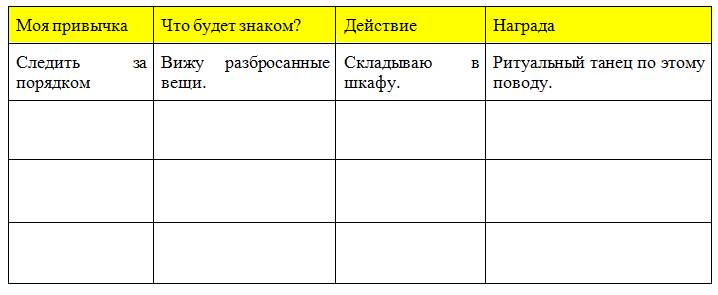 Итак, для создания новой привычки нужен знак, простое действие, которое будешь выполнять регулярно. Это обязательное условие. И награда за выполнение.