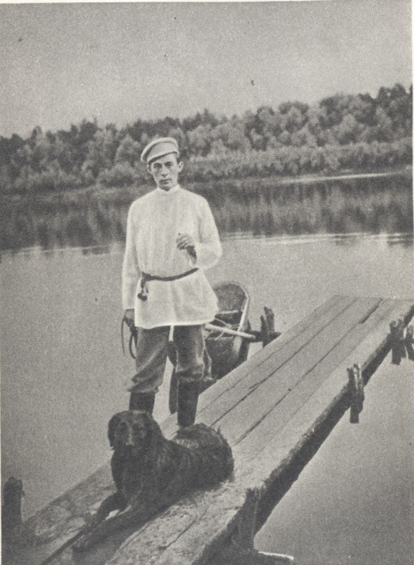 C. В. Рахманинов с собакой Левко на мостках у берега реки Хопер близ имения Красненькое. Фотография 1899 года