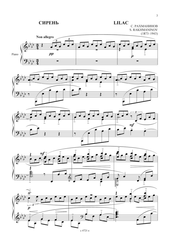 Несколько лет Лана прожила в России. В 20-х года она эмигрировала в Америку. От друзей или просто от случайных знакомых она знала, что Новый свет очень тепло принял знаменитого композитора, открыл перед ним двери всех прославленных залов, о нем много и восторженно писали. Лана понимала, что Рахманинов для нее потерян навсегда. Приехав в Нью-Йорк, она увидела большие афиши, извещающие о предстоящем концерте композитора. Лана долго стояла перед красочным объявлением и долго размышляла над тем, как ей быть. Наверное ее любимый уже свыкся с тяжелой потерей… Громкая слава… Неустанная работа… А самое главное – семья. Имеет ли она право нарушить прочный мир дорогих друг другу людей, оказавшихся здесь, на чужбине? Но как трепетно забилось ее сердце, какой несказанной радостью откликнулась ее одинокая душа на яркие буквы афиши! Лана купила билет на концерт, нашла фешенебельный цветочный магазин, где к услугам покупателей предлагалось все, что только они пожелают. Лана выбрала ветку белой сирени. Вечером эта ветка лежала на черной крышке рояля. Они снова были вместе.