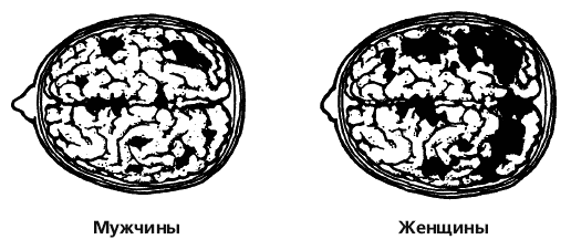 Затемненные области используются для функций речи и языка. Вы отчетливо видите, что у женщин способность к разговору гораздо больше, чем у мужчин. Это объясняет, почему, с женской точки зрения, мужчины так мало говорят. Это объясняет и то, почему, с мужской точки зрения, женщины никогда не могут заткнуться.