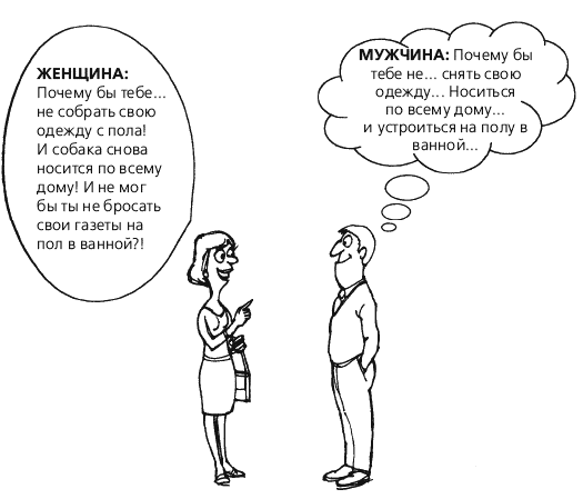 Основная ошибка заключается в ошибочности подхода к проблеме. Вместо того чтобы сказать: «Я ожидаю этого по праву», они говорят: «…ты никогда не выносишь мусор, ты отказываешься аккуратно развешивать свою одежду…» Они делят свою проблему на мелкие, тривиальные, незначительные укусы и высказывают косвенные, незначительные просьбы, призванные вызвать в мужчине чувство вины. Эти «просьбы», как правило, разделены на случайные группы, которые прослеживаются в косвенной речи. А ведь мужской мозг обладает весьма ограниченной способностью к распознаванию косвенной речи. Для мужчины подобные слова – все равно что раздражающие укусы москитов. Он ощущает зуд и раздражение, но никак не может прихлопнуть злодейское насекомое. «Я не прошу тебя о многом, ты же знаешь… И ты знаешь, что доктор запретил мне поднимать тяжести… Я все выходные убиралась в доме, стерла пальцы до кости, чтобы наша квартира выглядела красиво, а ты просто сидишь целый день, уставившись в телевизор… Если бы у тебя была совесть, ты бы починил отопление, ведь на этой неделе обещают похолодание…»