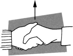 Доминирование передается путем поворота вашей руки (см. рисунок полосатый рукав) таким образом, что ладонь во время рукопожатия оказывается повернутой вниз. Ладонь не обязательно должна быть повернутой строго вниз, но при этом ваша рука все равно оказывается сверху. Тем самым вы показываете собеседнику, что стремитесь получить контроль над ситуацией.