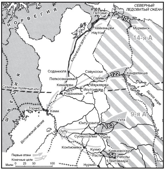 С точки зрения финнов, а в конечном счете и с советской тоже, стратегическое значение наступления Красной армии в целом возрастало с севера на юг. Поэтому потеря Петсамо в первые дни войны, хотя и вызывала сожаление, была предсказуемой и не порождала излишней тревоги. Из-за своей удаленности от источников поддержки Петсамо был весьма уязвим для атаки со стороны мощной базы советского Северного флота в Мурманске. Когда советские войска атаковали с суши, моря и воздуха, финны смогли выставить лишь 10-ю отдельную роту прикрытия и одну батарею из четырех старинных полевых орудий образца 1887 года. Советская 14-я армия быстро выполнила свои первые задачи – взяла сам порт и укрепила его, дабы предотвратить вмешательство третьих сторон4.