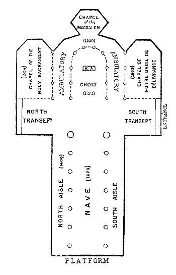 Now, go round the building to the R., to observe its arrangement. You pass first the chapels or bays of the S. Aisle, with weather-beaten sculpture, and then reach the slightly projecting South Transept. Beyond the South Portal, the Choir is hidden by the addition of a large projecting chapel (that of Notre-Dame-de-Délivrance), whose architecture will be better understood from the interior. At the East End, you get a good view of the Gothic Choir and Apse, with its external chapels and flying buttresses. The extreme East point is occupied by the ugly little hexagonal rococo Chapel of the Magdalen, a hideous addition of the 18th century. Still passing round in the same direction, you arrive at a second projecting Chapel (du Saint Sacremént), which balances the first. The best general view is obtained from the North Side, taking in the beautiful porch of the North Transept. (The handsome Louis XVI. building opposite is the Banque Nationale.)