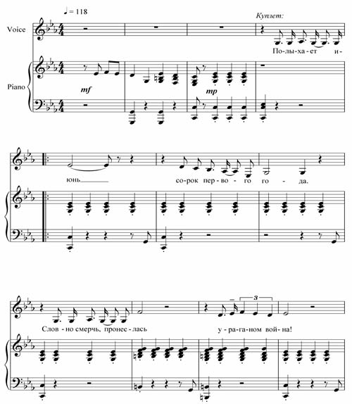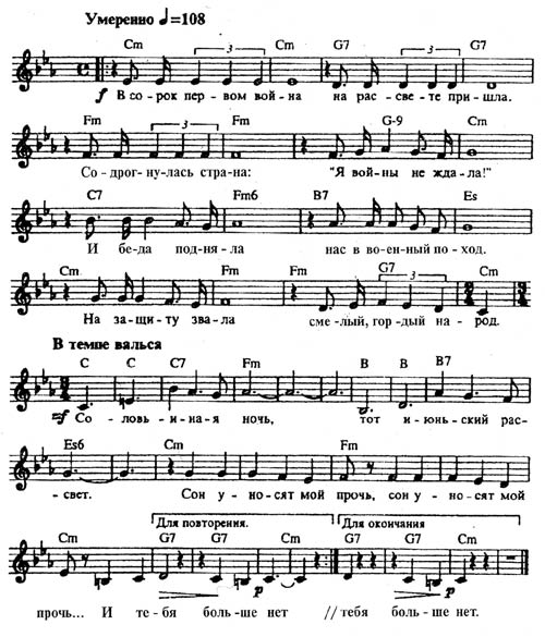 В сорок первом войнаНа рассвете пришла.Содрогнулась страна:«Я войны не ждала!»И беда поднялаНас в военный поход,На защиту звалаСмелый, гордый народ.Припев: Соловьиная ночь,Тот июньский рассветСон уносят мой прочь,Сон уносят мой прочь,И тебя больше нет…Не дарил ты мне роз,Взял на память кисет,Протянул прядь волос, —А я кинулась вслед.Золотистую прядьЯ в шкатулке храню,Вспомню любящий взглядДа слезу уроню.ПрипевБезответно пишуПисьма в юность свою,Боль унять я хочу,Я о боли пою.В руки локон беру,Закрываю глаза,Вновь с тобой говорю, —И живут голоса.Припев30 мая 1997 г.
