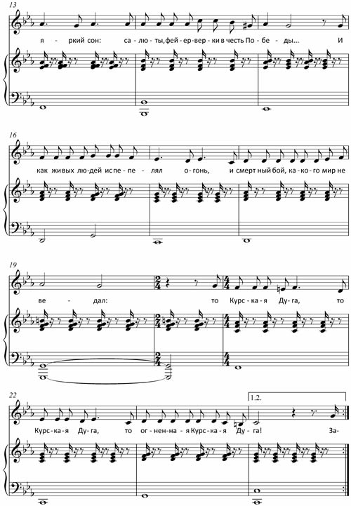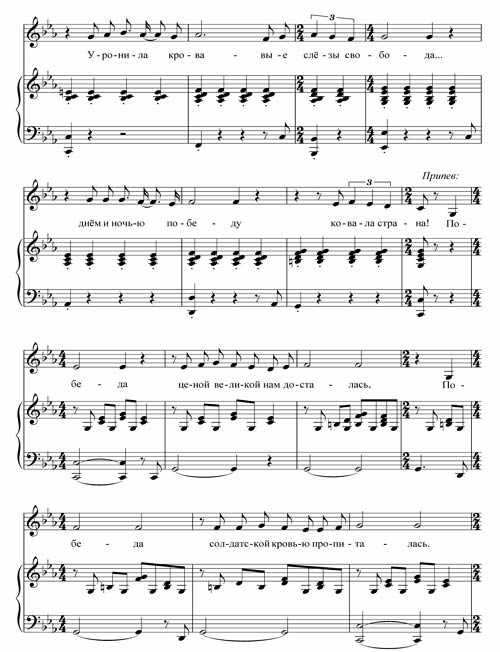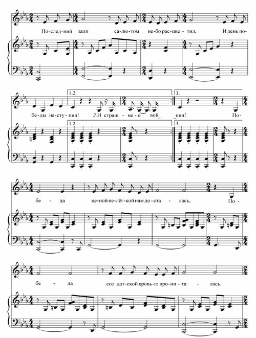 2. И страшнее войны вся планета не знала:Расплавлялись в огне и земля и металл,А Отчизна моя к миру всех призывала,Всю себя отдала на победный алтарь.Припев3. Путь геройский прошли мы к Великой победе,Ратный подвиг свершив, – разгромили врага!Дня счастливей народ мой спасённый не ведалИ прекрасней весны, что была так горька!Припев