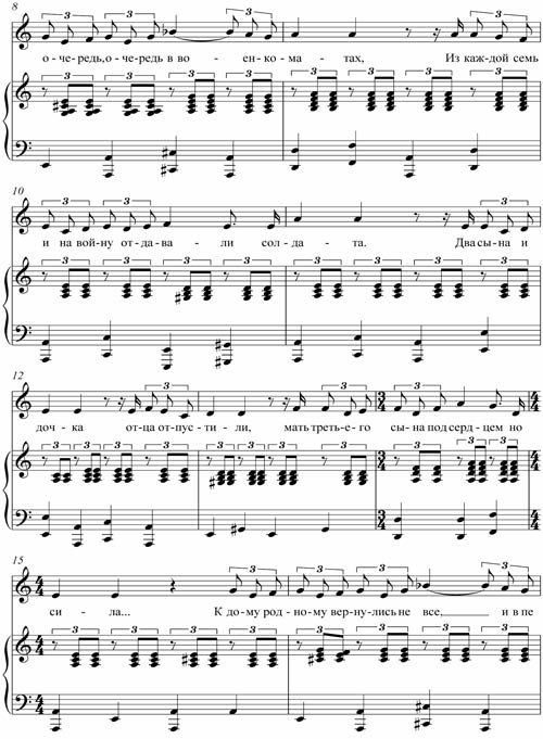 2. Плакали, пели, шумели метели,И чёрные косы снегами блестели.Вырос Павлушка – отца никогда не узнает.Вдова с головы чёрный плат никогда не снимает.И Родине внуки долг с честью отдали,А правнуки – в школу уже пошагали.Та же улыбка в них, голос и нежные взгляды.Так верит вдова, что любимый всегда с нею рядом!Припев.