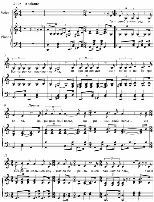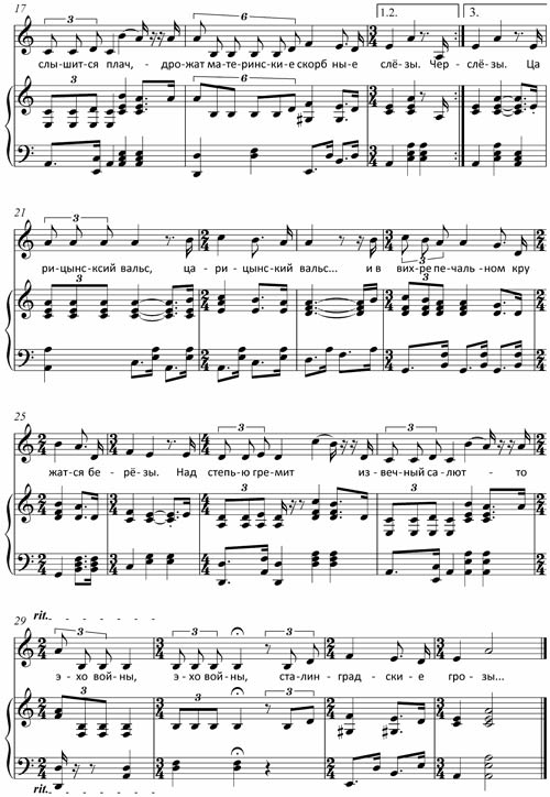 1. Горел СталинградИ Волга-река пламенела,От крови солдатВскипала она, багровела.Припев: Царицынский вальс, царицынский вальс…И в вихре печальном кружатся берёзы.В нём слышится плач, в нём слышится плач, —Дрожат материнские скорбные слёзы.2. Чернела заряИ ветры от горя стихали.Фонтаном земляПогибших сынов присыпала.Припев: Царицынский вальс, царицынский вальс…И в вихре печальном кружатся берёзы.В нём слышится плач, в нём слышится плач, —Дрожат материнские скорбные слёзы.3. Дымились вдалиСтепные духмяные травы —На них полеглиСолдаты великой державы.Припев: Царицынский вальс, царицынский вальс…И в вихре печальном кружатся берёзы.В нём слышится плач, в нём слышится плач, —Дрожат материнские скорбные слёзы.Царицынский вальс, царицынский вальс…И вихре печальном кружатся берёзы.Над степью гремит извечный салют,То эхо войны – сталинградские грозы…