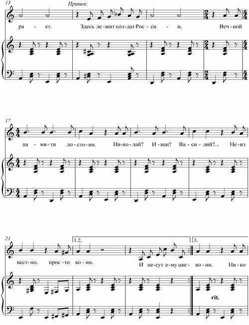 2. И несут ему цветыКаждый день и в день победыЗа спасённые мечты,За закаты и рассветы.3. Безмятежен крепкий сонНеизвестного солдатаТихо плещется огонь —Вечной памяти лампада.Припев.