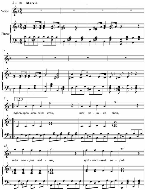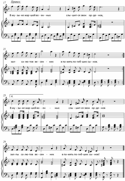1. Вдоль кремлёвских стен,Шаг чеканя свой,Шёл солдат войны, —Доблестный герой.Припев: В музыке маршей военныхСлышится звон орденов,Залпы салютов весеннихВ память погибших сынов.2. Помнит много бедРусская земля.Не сдалась врагамРодина моя.припев3. В майский день звонят,Бьют колокола,Славят всех солдат:Русь моя жива!припев (2 раза)