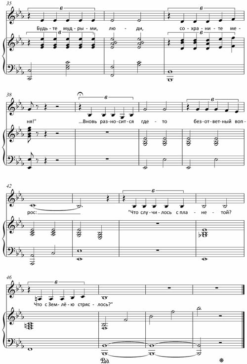 1. Прозвучал над ЗемлёюИз Вселенной вопрос:"Что случилось с тобою,Что с тобою стряслось?2. О, планета, ты гибнешьОт воды и огня.Тут и там катаклизмы…Что случилось, Земля?"3. И Земля отвечала,Лишь на миг замерев:"Видно, я одичала,Мой народ озверел…4. Как в бреду, задыхаюсь,И от горя черна,День и ночь возмущаюсь, —Так терзают меня!5. Бомбы рвутся, снаряды,Самолёты горят.Говорят канонады,И пожары дымят.6. Обращаюсь к вам, люди:Успокойте меня!Будьте мудрыми, люди,Сохраните меня!"7… Вновь разносится где-тоБезответный вопрос:"Что случилось с планетой?Что с Землёю стряслось?"