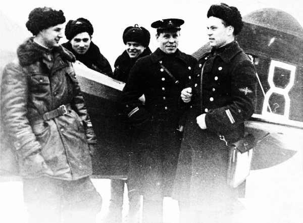 «Поломка не серьёзная», – докладывал Я.И.Бочков (первый слева) командиру отряда П.П.Смирнову (первый справа) командиру звена М.Д.Червакову (второй справа). На втором плане механики: П.В.Федоткин, И.Г.Ланин.