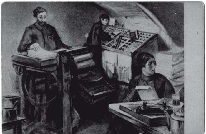 Фото 4. Рабочая обстановка типичной подпольной типографии XIX в.