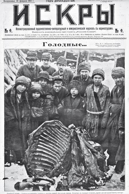 На фото – группа голодающих башкир у скелета павшей от голода лошади. Село Медведка (ныне – Орен бургская область). «Несмотря на страшное зловоние, – говорится в тексте под фотографией, – далеко распространяющееся, они продолжают этой кониной утолять голод»