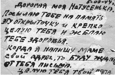 «5-09-44 г. Дорогая моя Натусенька. Посылаю тебе на память эту открыточку и крепко целую тебя и желаю тебе здоровья. Когда я напишу маме свой адрес, то буду ждать от тебя письма. Целую тебя, твой папа».