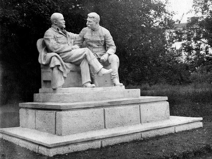 Типовая скульптурная группа «В.И. Ленин и И.В. Сталин в Горках» по мотивам одноименной фотографии 1922 г. Являлась одной из самых массово тиражируемых в Советском Союзе.