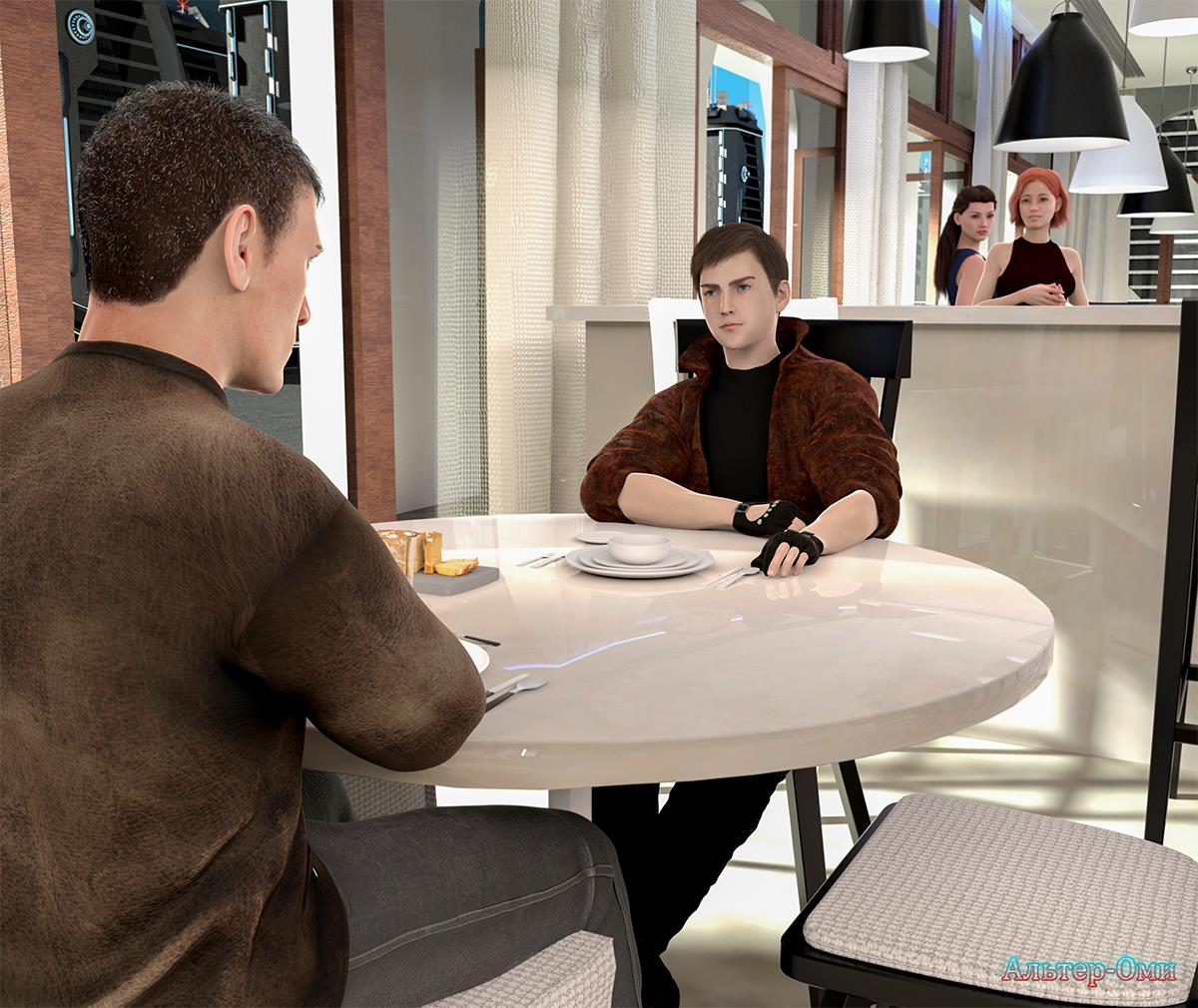 Народу в кафе было много, и все дружно повернули голову чтобы рассмотреть вошедших. Что про одного, что про другого ходило много сплетен. Основными посетителями этого заведения являлись работники корпорации, а вот начальство заходило сюда нечасто. Верд уверенно прошёл к столику у окна, не обращая внимания на улыбки и заинтересованные взгляды девушек-официанток. Элл последовал за ним.