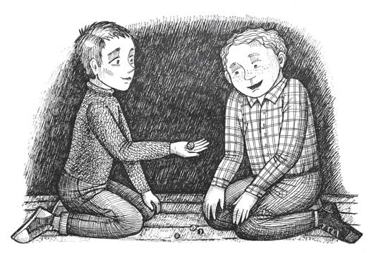 Играли так: кто-то ставил свой шарик в центр поля. Два игрока расходились в разные стороны и выбирали себе по шарику-битку́. Затем по битку надо было щелкнуть так, чтобы он покатился вперед и попал в чужой шарик, стоящий посередине. Тот, кто выбивал шарик из центра, забирал его себе. Хотя Ваня с Борькой дружили с первого класса и в конце партии всегда возвращали друг другу отыгранные шарики.