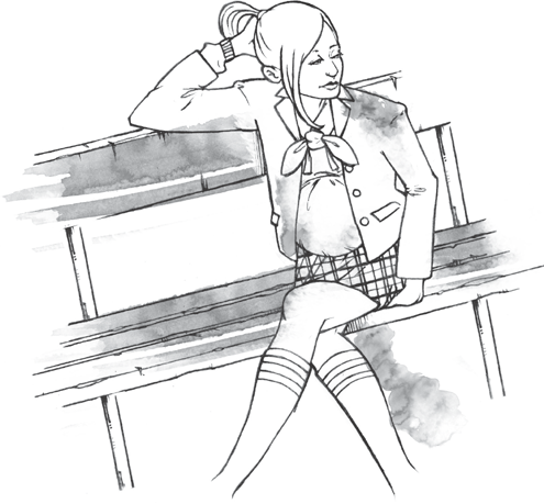 A girl lay back on a bench, roughly sketched in scrawls of ink as she looked out over the moat of Sunpu Park. She wore a school uniform, a tartan skirt clinging to her crossed legs. Little tufts of grass and flowers tangled with the bench legs, which had to be creative license—it was still too cold for blooms.
