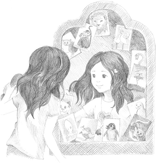 К раме зеркала было прикреплено столько открыток, что девочка едва видела собственное отражение. Каждая открытка пришла из какого-то очень далёкого места. На всех были изображены экзотические животные. Здесь можно было увидеть грациозных газелей, пасущихся в саванне, застенчивого медвежонка панды в горах Китая и целую стаю рыб-ангелов, сверкающих, словно алмазы, в водах Амазонки.