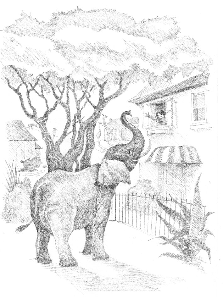 Из зарослей баньяновых деревьев появился кончик серого хобота. Спустя миг выступил и его обладатель целиком – с бивнями, тяжёлой серой головой и большими хлопающими ушами. Это и был Оскар – старый африканский слон. Он посмотрел на девочку мудрыми, добрыми глазами и поднял хобот.