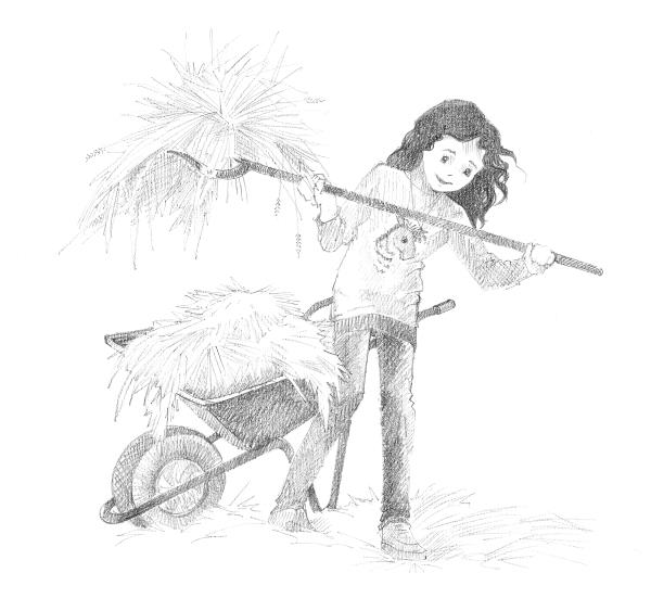 Зоуи взялась за ручки тачки и покатила её в дом жирафов. Там она схватила вилы и стала раскладывать солому по полу ровным слоем. Вечером у животных будет замечательная чистая, свежая постель!