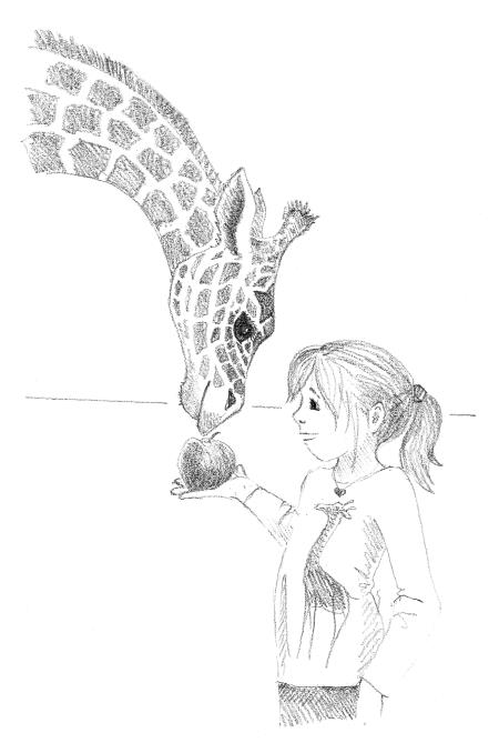 – Просто протяни руку вперёд и держи яблоко на раскрытой ладони. Не бойся, Дейзи не укусит. Она очень аккуратная, – объяснила Зоуи, с улыбкой глядя на свою пятнистую подругу. Очень плавно жирафиха согнула шею и понюхала руку девочки, осторожно взяла фрукт зубами и счастливо им захрустела. Эми ахнула.