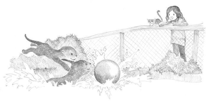 Зоуи и Мип подбежали к ограде, и лемур забрался на голову девочки для лучшего обзора. Джесс, которая присматривала за выдрами, держала в руках жёлтый резиновый мячик. Детёныши выдры – Отто и Бенедикт – радостно ждали на берегу, нетерпеливо качая головами вверх-вниз. Джесс бросила мячик в воду, и выдры с громкими всплесками нырнули за ним. Отто добрался до игрушки первым и подкинул её в воздух ловким ударом носа. Его брат счастливо заурчал и сделал вращение в воде.