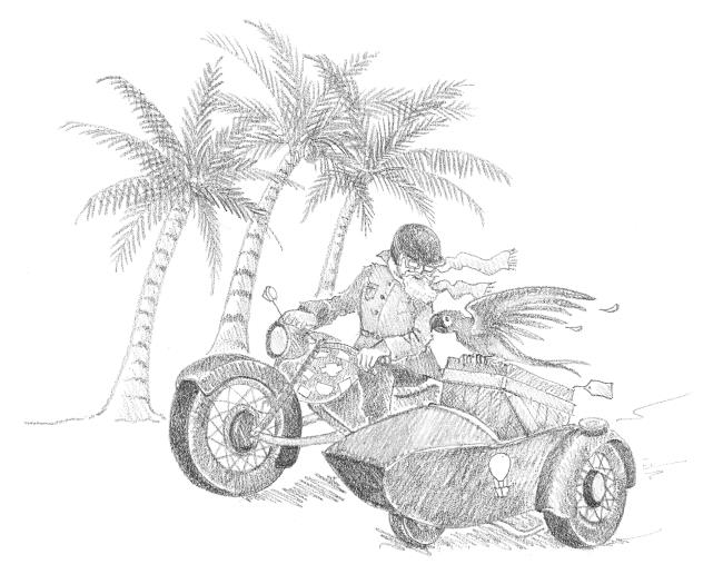 С визгом шин мотоцикл остановился прямо перед ними. На номере значилось «СПАСАТЕЛЬ 1», и весь корпус мотоцикла покрывали цветные наклейки из разных стран мира, которые посетил дедушка Хорас. К мотоциклу крепилась пассажирская коляска с символом зоопарка – полосатым воздушным шаром. Внутри неё сидела большая и очень недовольная на вид птица, синие перья были взъерошены и спутаны. Это была Кики, гиацинтовый попугай ара. Они с дедушкой Хорасом были лучшими друзьями (прямо как Зоуи и Мип!) и везде путешествовали вместе.