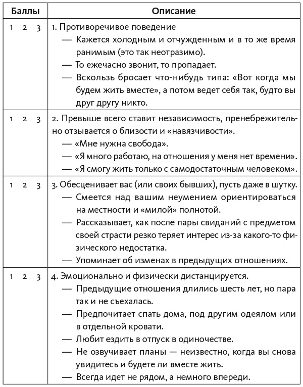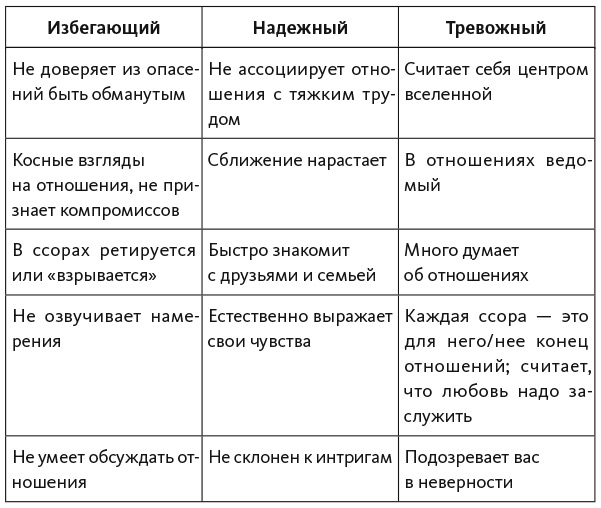 Это первое, что следует выяснить, все прочие черты и поступки проистекают отсюда. Если человек не хочет сближения, то, скорее всего, относится к избегающему типу. Желание близости свойственно надежному и тревожному типам (подробнее о двух определяющих критериях типа привязанности в главе 3). Отбросьте стереотипы, тип привязанности никакого отношения к чертам характера не имеет. Самоуверенный нахал вполне может искренне желать близости. Подумайте, что в поведении человека говорит о его истинных желаниях? Что он делает или, наоборот, – чего не делает, чтобы увеличить дистанцию?