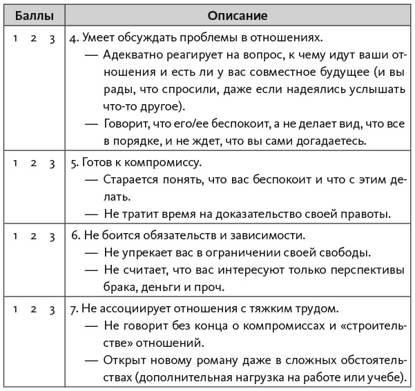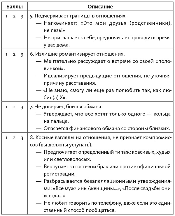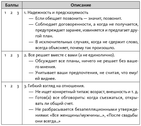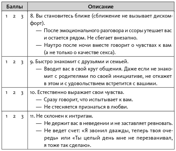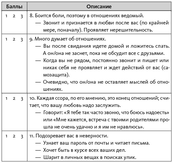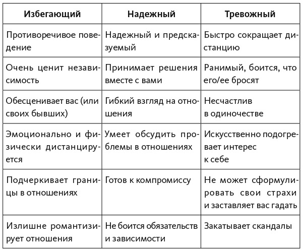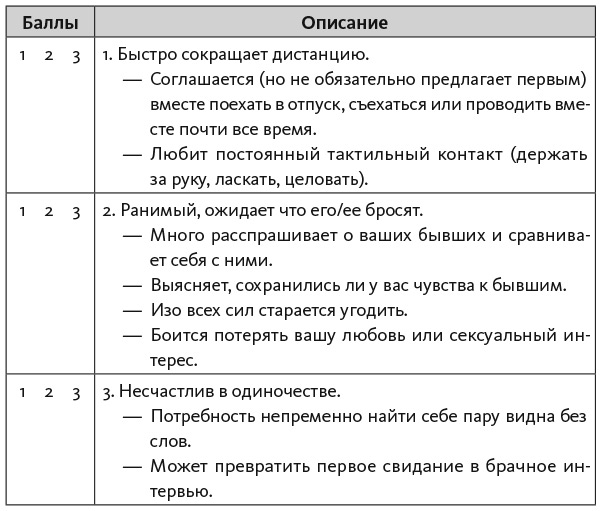 На свиданиях вас не будет беспокоить мысль: «Нравлюсь ли я?» Вы задумаетесь: «Подходит ли мне этот человек? Стоит ли мне эмоционально вкладываться в отношения? Сможет ли он дать мне то, что мне нужно?» Развитие отношений будет зависеть от вашего выбора: «Насколько человек готов к близким отношениям? Правда ли он этого хочет?» Прочитав эту главу и некоторое время потренировавшись, вы научитесь оценивать тип привязанности на раннем этапе. Не забывайте, что объективность несовместима с влюбленностью, когда вы смотрите сквозь розовые очки. Недостатки теряются на фоне сияющего образа. В самом начале отношений важно учитывать и анализировать всю информацию, чтобы не ошибиться в выборе и направить отношения в позитивное русло.